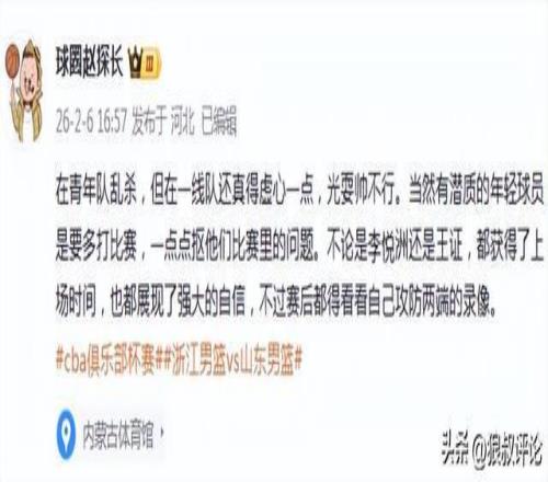 媒体人赵探长发文点评:在青年队乱杀,但在一线队还真得虚心一点,光耍帅不行。当然有潜质的年轻球员是要多打比赛,一点点抠他们比赛里的问题。
