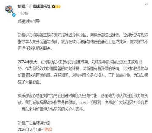 2月13日,新疆广汇篮球俱乐部发布公告,称主教练刘炜因身体原因辞职。全文如下: