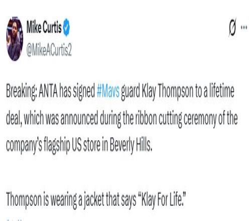 报道称,全明星周末期间,安踏在美国的首家线下零售店开业。活动现场,安踏突然宣布:与克莱签下终身球鞋合同,合约将延续至他退役之后,全场为之惊喜。