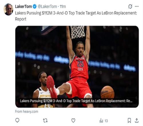 北京时间2月14日晚,湖媒Laker Tom也透露,在2026年休赛期湖人队有引进三年1.12亿合同的墨菲的打算。