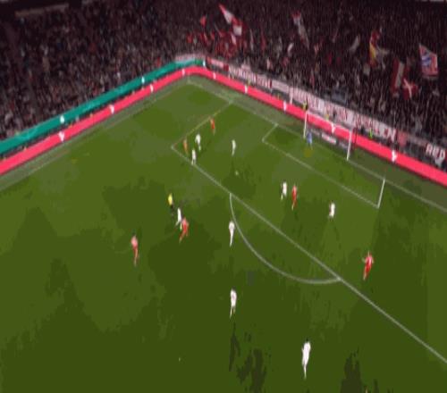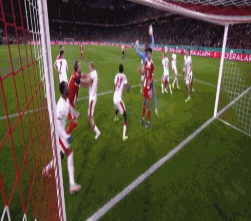 第9分钟,有点滑稽,凯恩门前头球攻门击中队友头部