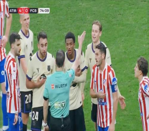 马竞全线回防,西蒙尼换上了更多的防守球员,令巴萨的推进更加困难。第85分钟,埃里克加西亚直接被红牌罚下,随即产生的各种争议,引发了一系列的冲突,裁判连续出示多张黄牌平息。