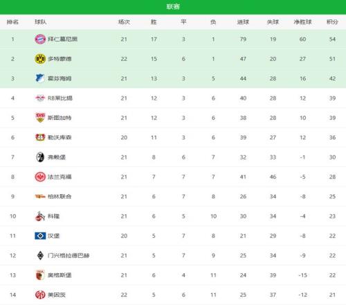 下面是德甲最新积分榜!