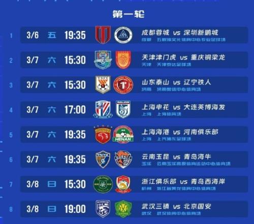 3月6日,中超揭幕战将在成都进行,成都蓉城将主场对阵深圳新鹏城,首次为成都蓉城出场的拜合拉木就将对阵老东家。辽宁铁人、重庆铜梁龙分别客场对阵山东泰山、天津津门虎,这将是两支球队的中超处子秀。