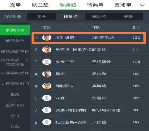 第二个,这是中超真正的超级空霸。身高1米94的他,上赛季在瑞典是联赛争顶成功最多的球员,也是整个联赛拦截数最高的球员,能力相当强,要知道,在北欧这种身体素质极高的联赛都能拿下争顶王,中超其他球员想和他争头球基本上很难了。
