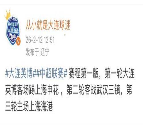 赛程上,大连英博开局场场硬仗,据博主《从小就是大连球迷》透露,第一版赛程,大连英博首轮客场对阵上海申花,第二轮客战武汉三镇,第三轮迎来首个主场,对阵上海海港。大连今年是拿了去年长春亚泰的剧本,只不过不是三连客,上个赛季,大连英博对阵申花1负1平,与三镇战至两场平局,主客场遭到了上海海港的双杀,今年开局三连败也并非没有可能。